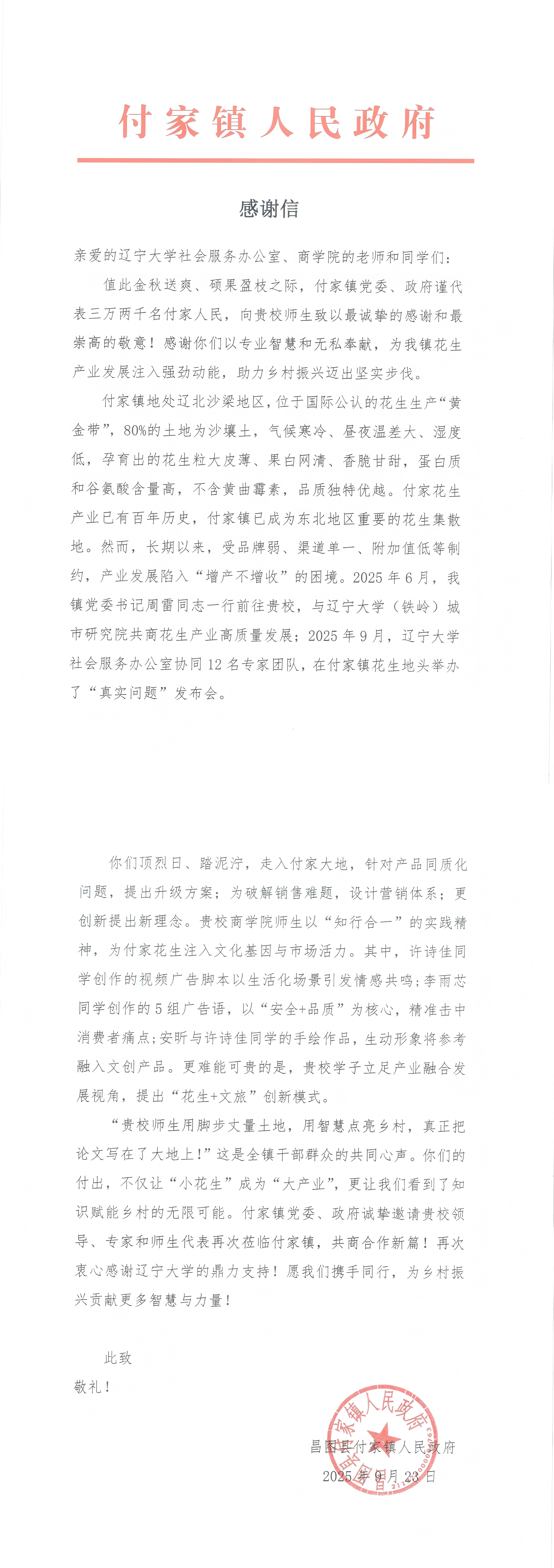 9月23日,昌图县付家镇人民政府向澳门十大信誉好的网站师生发来感谢信,信中对澳门十大信誉好的网站社会服务办公室以及澳门十大信誉好的网站师生表达了诚挚谢意。