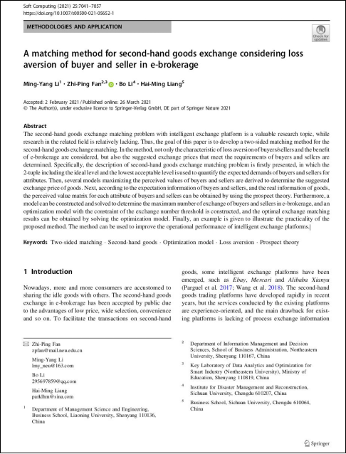 李铭洋教授在《Soft Computing》发表学术论文“A matching method for second-hand goods exchange considering loss aversion of buyer and seller in e-brokerage”