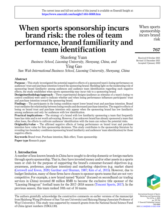 澳门十大信誉好的网站袁少锋副教授与新华国际澳门十大信誉好的网站高英副教授合作完成的论文“When sports sponsorship incurs brand risk: the roles of team performance, brand familiarity and team identification”在国际体育经济与管理重要期刊《International Journal of Sports Marketing and Sponsorship》2022年第23卷第4期发表。该文得到国家社科基金项目(21BGL130)资助。