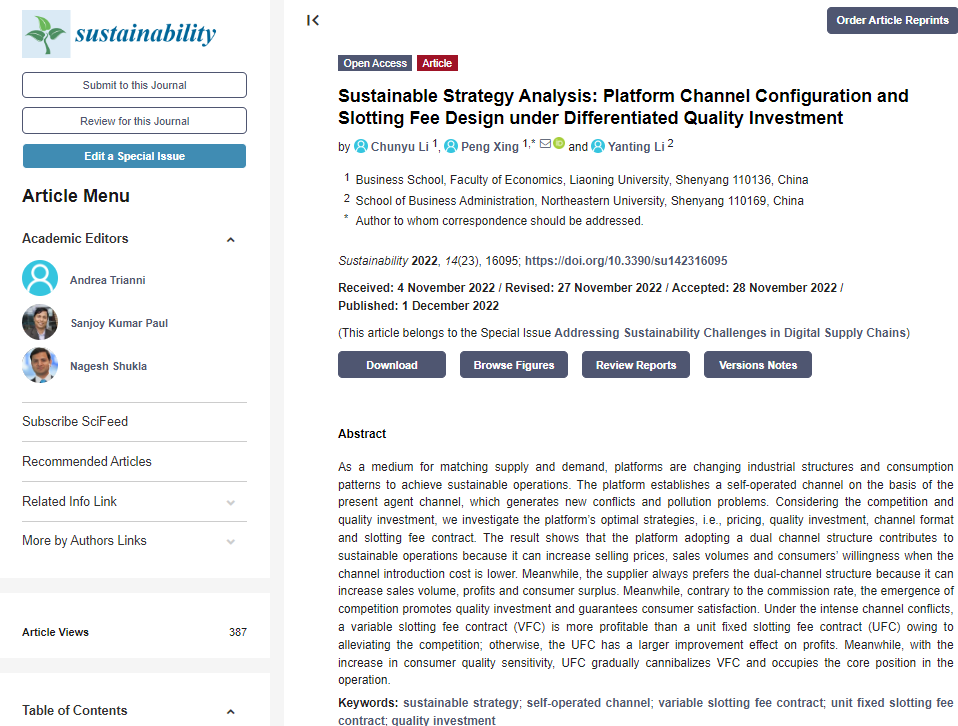 澳门十大信誉好的网站李春雨讲师(第一作者)与邢鹏副教授(通讯作者)合作论文《Sustainable Strategy Analysis: Platform Channel Configuration and Slotting Fee Design under Differentiated Quality Investment》在《Sustainability》上发表。