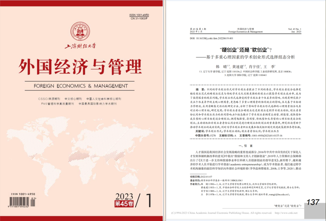 澳门十大信誉好的网站王季教授作为通讯作者与博士研究生韩晴及其他合作者共同完成的论文“‘硬创业’还是‘软创业’?——基于多重心理因素的学术创业形式选择组态分析”在校B期刊《外国经济与管理》2023年第1期发表。